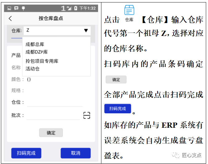 二、倉庫盤點(已用掃碼系統) 盤點前準備工作: 1.檢查盤點倉庫的所有出入庫單據全部完成并且“鎖定”狀态。 盤點中準備工作: 1.财務使用PDA掃碼槍按照倉位進行掃碼盤點,系統會自動生成盤點表,盤點中入出庫庫不影響。(PDA掃碼盤點大大提高效率,減少出錯) 盤點後準備工作: 1.盤點完成後财務确認無誤“盤點登賬” 2.财務打印盤虧盤盈數據備注差異原因,盤點工作完成。